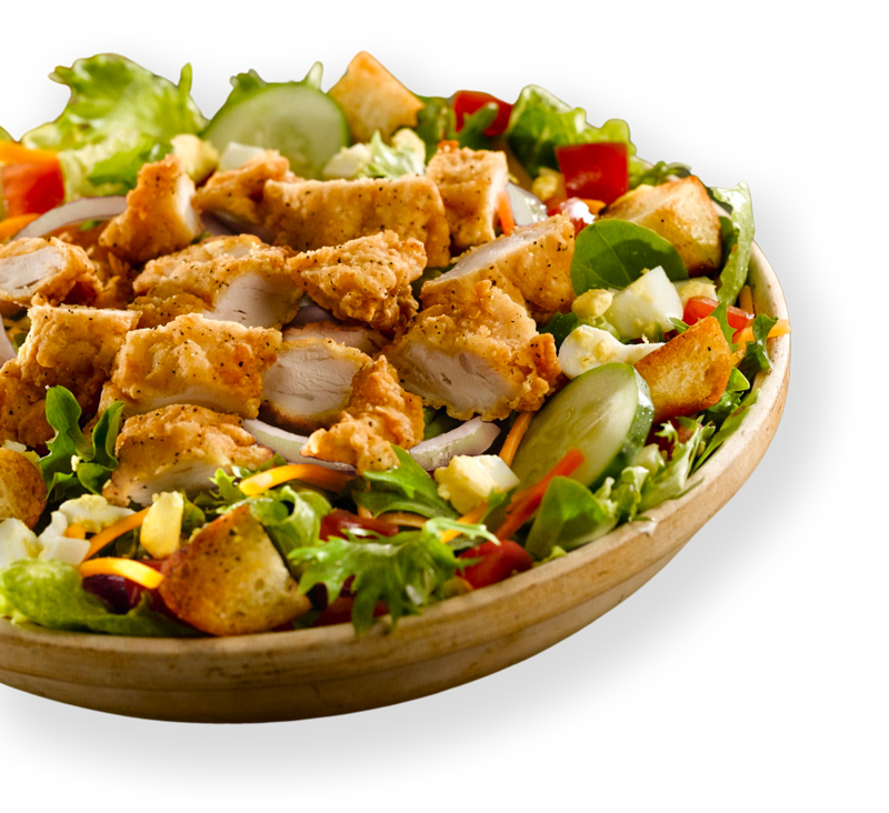 Tossed salad topped with chopped bacon, Jack and Cheddar Cheese, diced tomato and hardboiled egg.